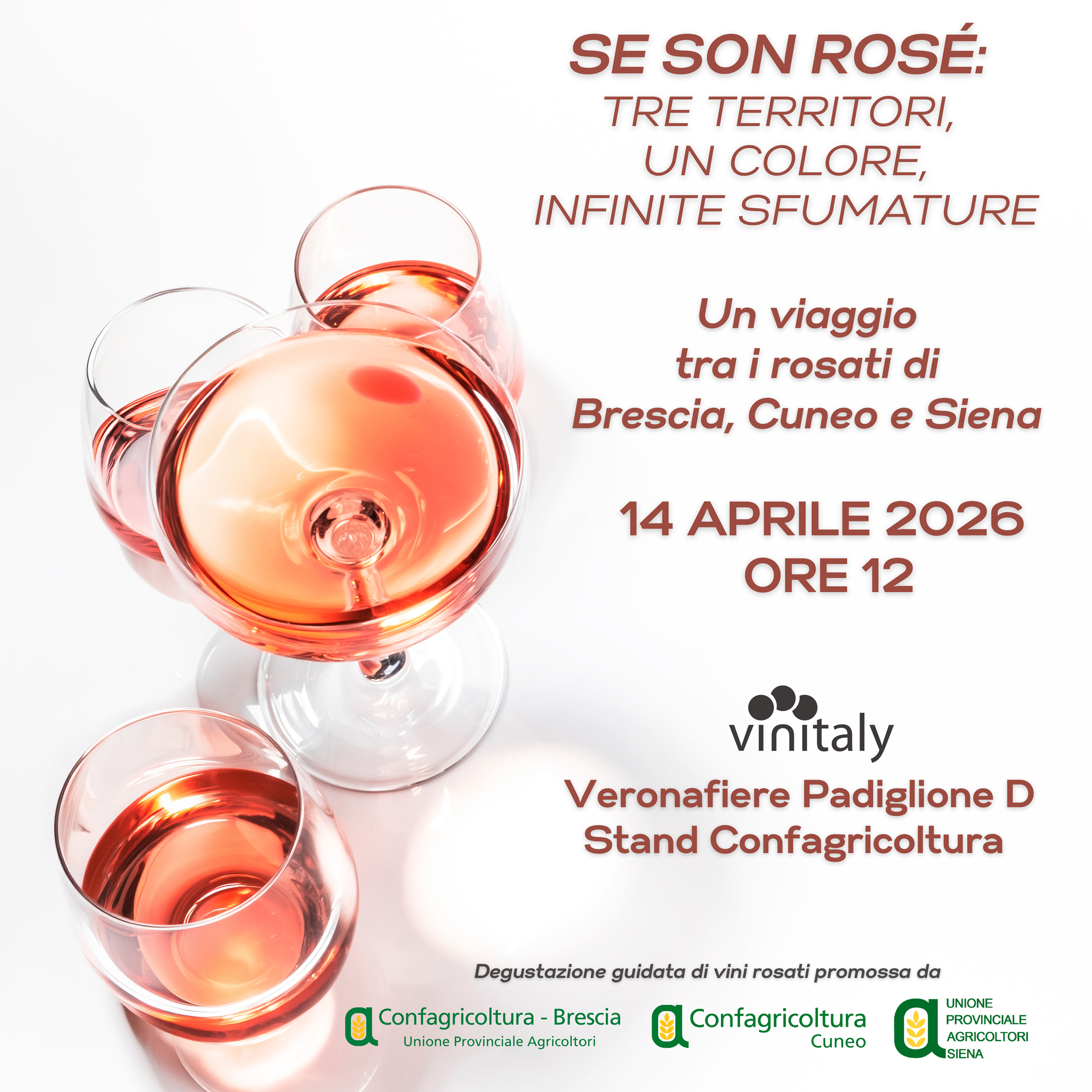 Martedì 14 aprile, alle 12, presso lo stand di Confagricoltura al Vinitaly di Verona (Padiglione D), si terrà l’evento “Se son rosé: tre territori, un colore, infinite sfumature”, organizzato da Confagricoltura Cuneo, Confagricoltura Brescia e Unione Provinciale Agricoltori di Siena. Un viaggio tra identità e sfumature del vino rosato: è questo lo spirito della degustazione guidata che metterà a confronto le interpretazioni del rosé di tre importanti aree vitivinicole italiane – Cuneo, Brescia e Siena – offrendo al pubblico un’esperienza sensoriale capace di raccontare, attraverso un unico colore, la ricchezza e la diversità dei territori. A moderare l’incontro sarà, come nelle precedenti edizioni, la narratrice digitale e sommelier Adua Villa, che accompagnerà i partecipanti in questo percorso tra calici e storie di produzione.