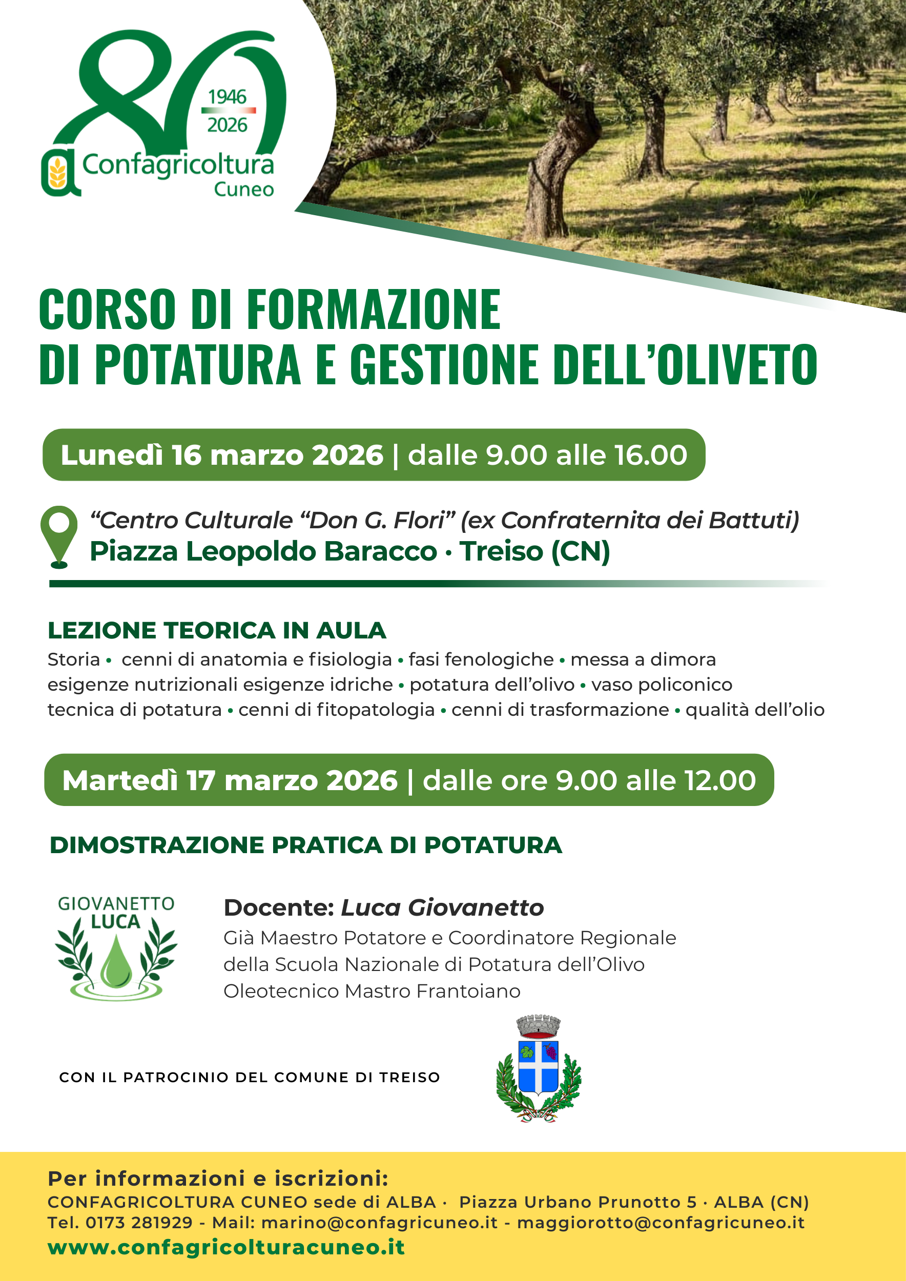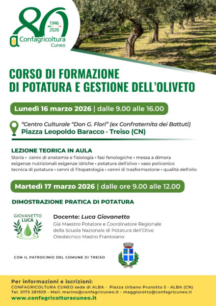 Lunedì 16 marzo, dalle 9 alle 16, e martedì 17 marzo, dalle 9 alle 12, presso il centro culturale “Don G. Flori” di Treiso (piazza Leopoldo Baracco), Confagricoltura Cuneo organizza il “Corso di formazione di potatura e gestione dell’oliveto”. La prima giornata sarà dedicata alla formazione in aula con cenni di anatomia e fisiologia, fasi fenologiche, messa a dimora, esigenze nutrizionali e idriche, potatura dell’olivo, vaso policonico, tecnica di potatura, cenni di fitopatologia, di trasformazione e sulle qualità dell’olio. La mattinata del martedì, invece, vedrà l’intervento del docente Luca Giovanetto, già Maestro Potatore e coordinatore regionale della Scuola Nazionale di Potatura dell’Olivo Oleotecnico Mastro Frantoiano, che proporrà una dimostrazione pratica di potatura. La due giorni è organizzata con il patrocinio del Comune di Treiso. Per informazioni e iscrizioni contattare la Confagricoltura Cuneo sede di Alba al numero 0173/281929 o scrivendo a marino@confagricuneo.it e maggiorotto@confagricuneo.it.