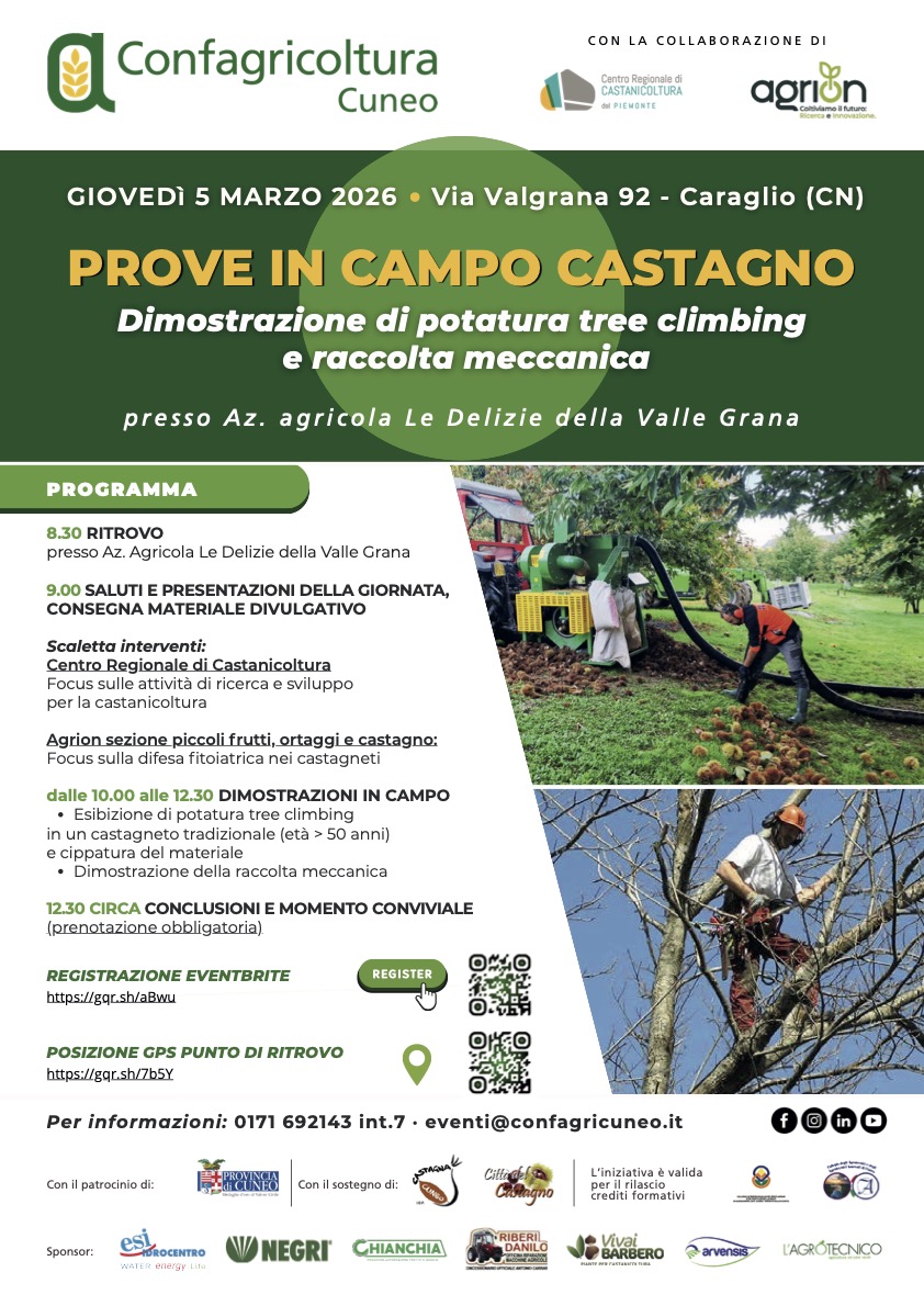 Giovedì 5 marzo 2026, dalle 8.30 fino a tarda mattinata, l’azienda agricola “Le Delizie della Valle Grana” di Caraglio (via Valgrana 92) ospiterà l’incontro “Prove in campo castagno – Dimostrazione di potatura tree climbing e raccolta meccanica”, promosso da Confagricoltura Cuneo. L’appuntamento, organizzato con il patrocinio della Provincia di Cuneo e il sostegno di Cuneo Castagna IGP e dell’associazione nazionale Città del Castagno, intende fornire un aggiornamento sulle pratiche colturali e sulle innovazioni meccaniche applicate alla castanicoltura e prevede una sessione tecnica e prove in campo. L’evento è aperto a tutti gli operatori del settore, con prenotazione al link: https://gqr.sh/aBwu. Per maggiori informazioni contattare Confagricoltura Cuneo al numero 0171/692143 (int. 7) o scrivendo a eventi@confagricolturacuneo.it.