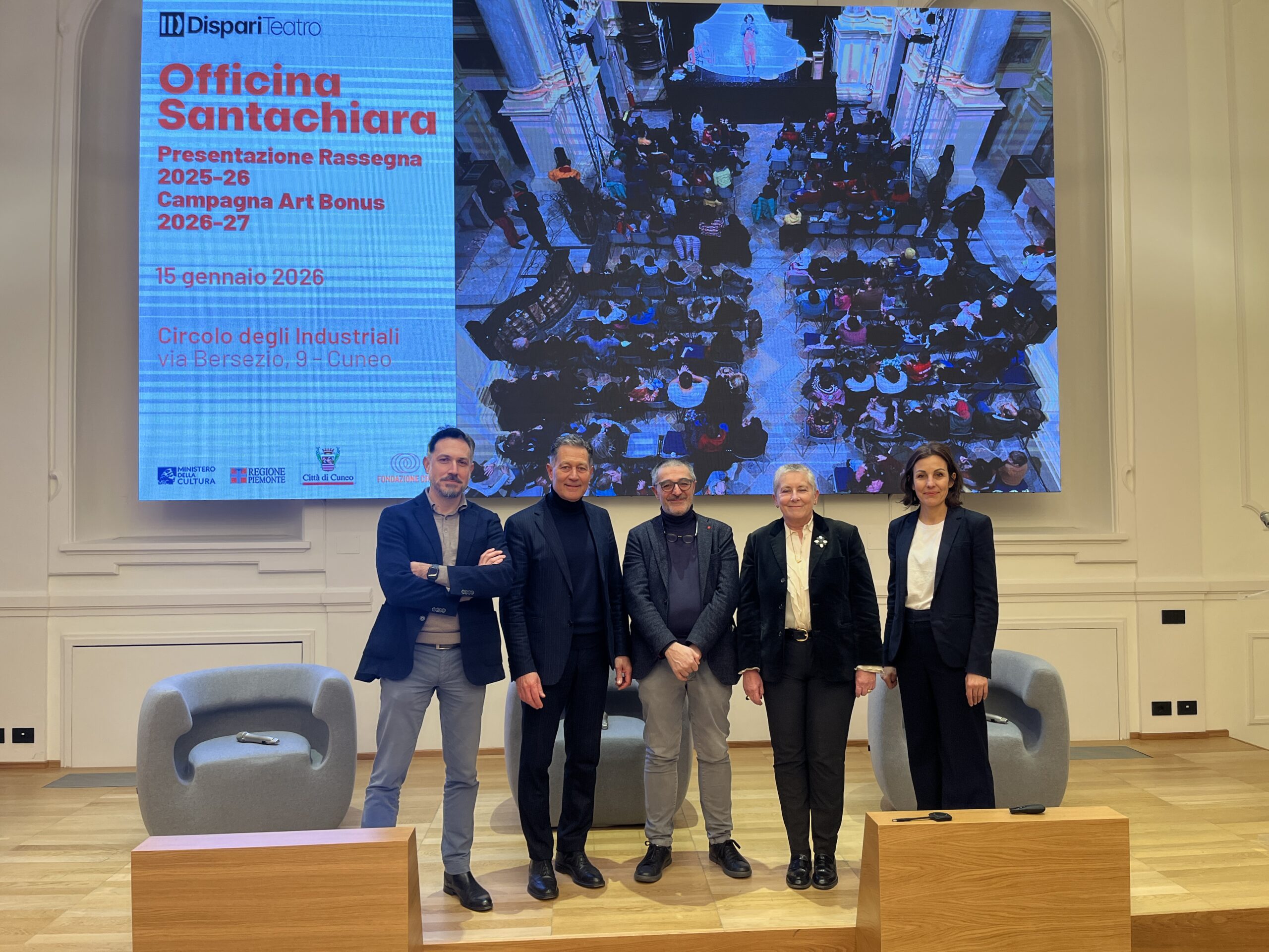 Dispari Teatro il nuovo Centro di Produzione Teatrale nato dall’unione di Compagnia Il Melarancio, Onda Teatro e Teatro Popolare Europeo ha presentato giovedì 15 gennaio in Confindustria Cuneo la stagione teatrale 2026 di Officina Santachiara, una programmazione che propone un calendario ricco e articolato di 110 spettacoli l’anno rivolti a bambini, famiglie, giovani e adulti, confermando Officina Santachiara come uno spazio di riferimento per la produzione, la diffusione e la fruizione teatrale sul territorio cuneese. La presentazione è stata inoltre occasione per lanciare ufficialmente la campagna Art Bonus a favore di Dispari Teatro che consente a cittadini e imprese di sostenere la cultura beneficiando di un credito d’imposta pari al 65% dell’importo donato. All’appuntamento sono intervenuti Pierluigi Vaccaneo (presidente Sezione Cultura ed eventi di Confindustria Cuneo), Patrizia Manassero (sindaca di Cuneo), Cristina Clerico(assessora alla Cultura) e Mauro Gola (presidente Fondazione CRC). Ha inviato un suo messaggio Alberto Cirio (presidente Regione Piemonte). Per rimanere aggiornati su programmazione, approfondimenti e iniziative speciali è possibile seguire Officina Santachiara sui canali social, iscriversi alla newsletter oppure contattare l’organizzazione al numero 339/1277798 o scrivendo a biglietteria@dispariteatro.it. Sito internet: www.dispariteatro.it.