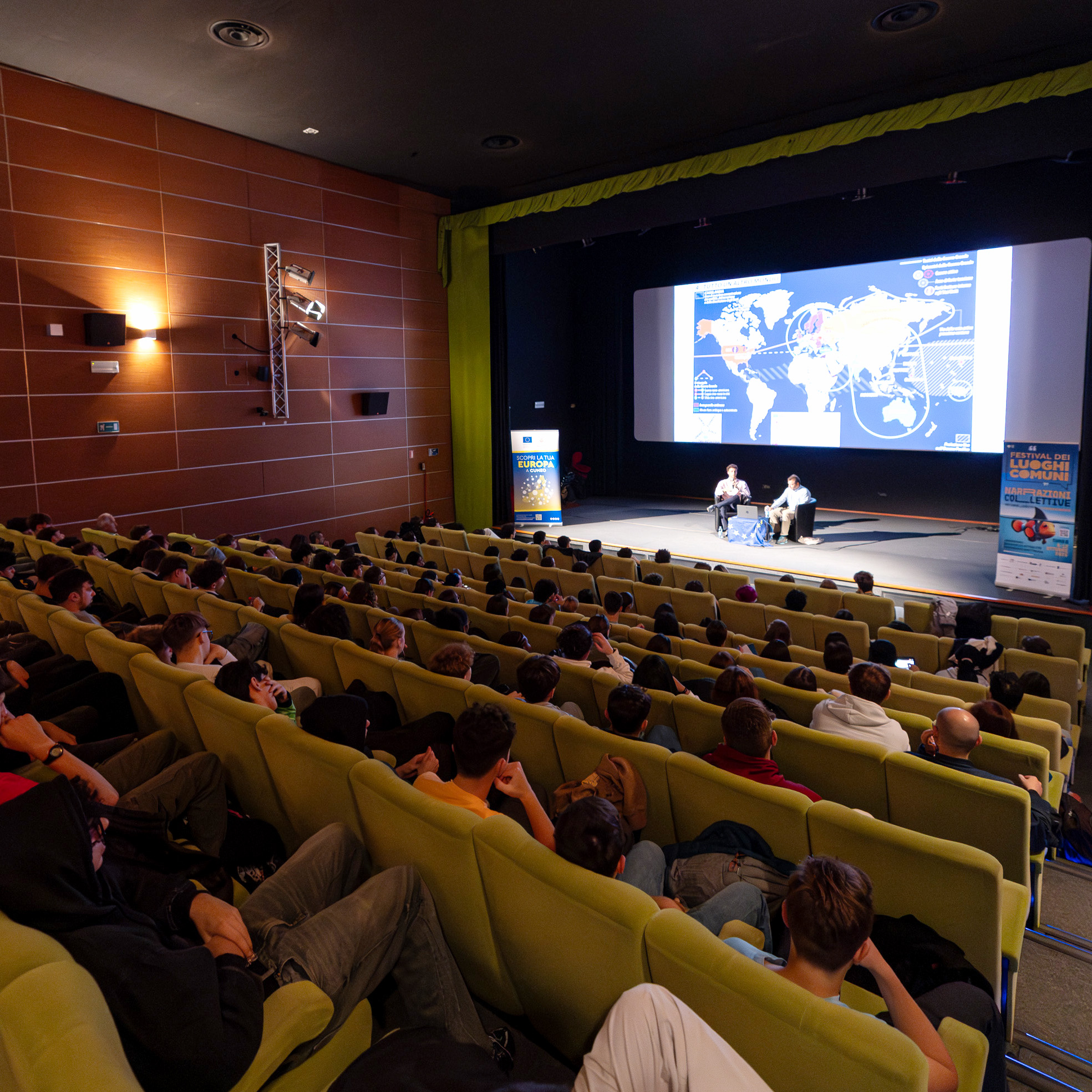 Il Festival dei Luoghi Comuni, come da tradizione, ha destinato alcuni appuntamenti alle scuole. Per due giornate, lo sceneggiatore di Topolino, Alessandro Sisti, e i disegnatori di Topolino, Simona Capovilla e Blasco Pisapia, hanno saputo incantare gli studenti con laboratori di scrittura creativa a più mani e un workshop di disegno collettivo. Gli allievi delle scuole secondarie di secondo grado, invece, sono rimasti incollati alle poltrone del cinema teatro Monviso durante l’intervento degli analisti geopolitici di Limes, Fabrizio Maronta e Giacomo Mariotto sul crescente disordine globale tra guerra in Ucraina, Medio Oriente in fiamme, Balcani in tensione e crisi americana.