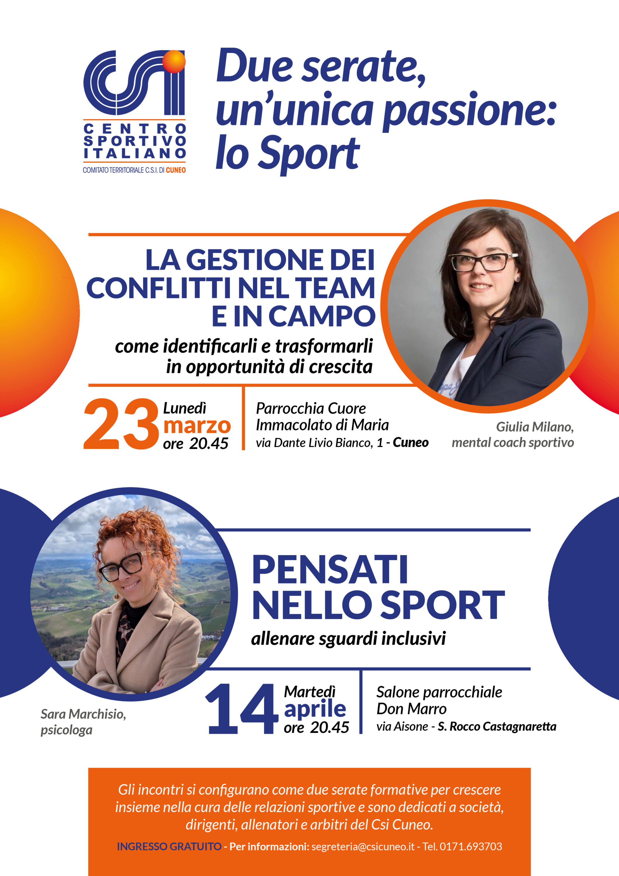 Lunedì 23 marzo, alle 20.45, presso la parrocchia Cuore Immacolato di Maria di Cuneo (via Dante Livio Bianco, 1) prende il via il percorso di cinque serate organizzato dal comitato territoriale CSI di Cuneo dedicato alla cura delle relazioni sportive e pensato per dirigenti, allenatori e arbitri della provincia. Relatrice della prima serata sarà la mental coach sportiva Giulia Milano che approfondirà il tema de “La gestione dei conflitti nel team e in campo: come identificarli e trasformarli in opportunità di crescita”. Il secondo appuntamento si terrà invece martedì 14 aprile, alle 20.45, presso il salone parrocchiale Don Marro di San Rocco Castagnaretta (via Aisone) e sarà tenuto dalla psicologa Sara Marchisio che proporrà l’intervento “Pensati nello sport: allenare sguardi inclusivi”. Gli ultimi tre appuntamenti si svolgeranno nel corso del 2026. L’ingresso alle serate è libero e gratuito. Per maggiori informazioni scrivere a segreteria@csicuneo.it o contattare il numero 0171/693703.