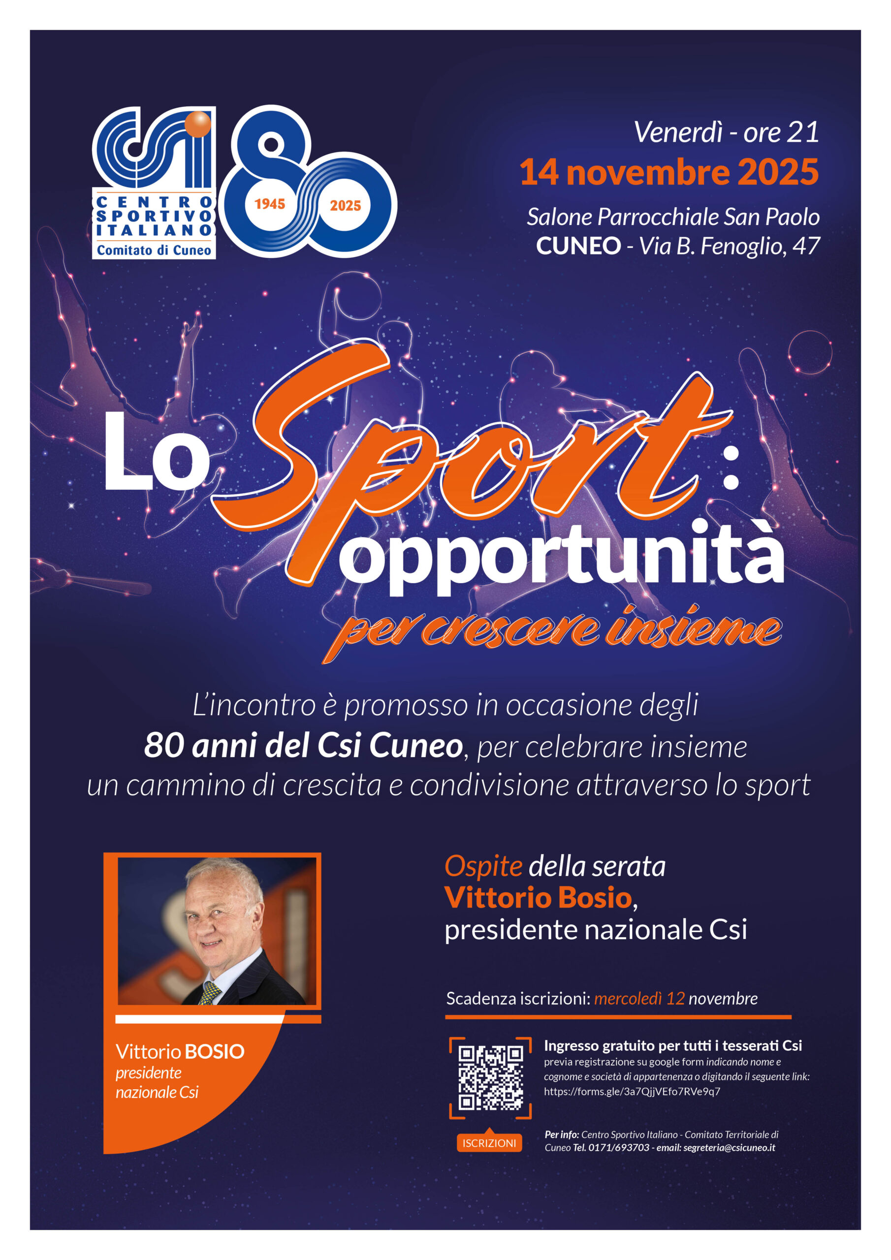 “Celebrare gli 80 anni del Csi Cuneo significa ripercorrere una storia fatta di persone, comunità e passione educativa – dichiara il presidente del Csi Cuneo, Mauro Tomatis -. In questi decenni lo sport è stato per noi molto più di un gioco: è stato un mezzo di crescita umana, di inclusione e di dialogo, capace di unire generazioni e territori diversi. Oggi più che mai crediamo che lo sport debba essere un’esperienza che educa alla relazione, alla responsabilità e al rispetto, valori fondamentali per costruire una società più giusta e solidale. L’incontro proposto vuole proprio ricordarci questo: che lo sport è bello quando si vive insieme, quando diventa cammino condiviso e strumento di speranza per i più giovani e per le nostre comunità”.